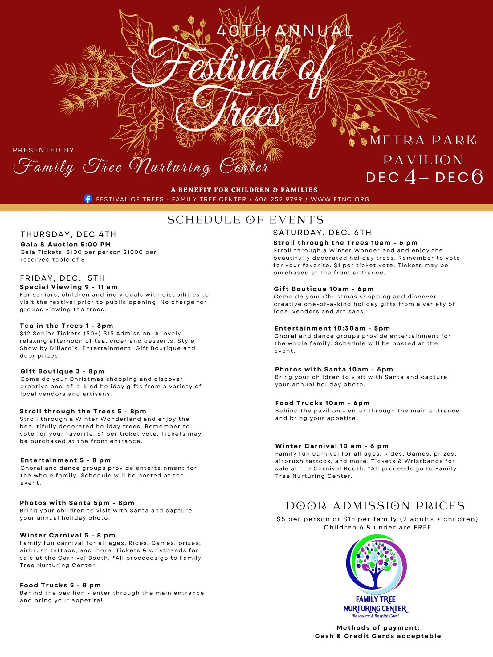 Since 1985, Family Tree Nurturing Center Festival of Trees has become synonymous with the holiday season in Billings, MT. For many residents and visitors, the holidays would not be complete without at least one visit to view the beautiful trees or participate in the weekend activities.